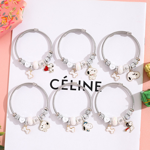 Hochwertiges, versilbertes Edelstahl-Charm-Armband mit Cartoon-Hund, Großlochperlen und Herzanhänger für Mädchen